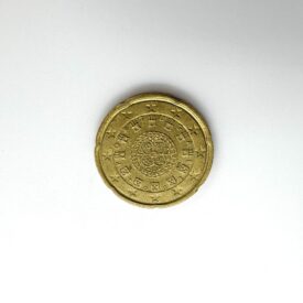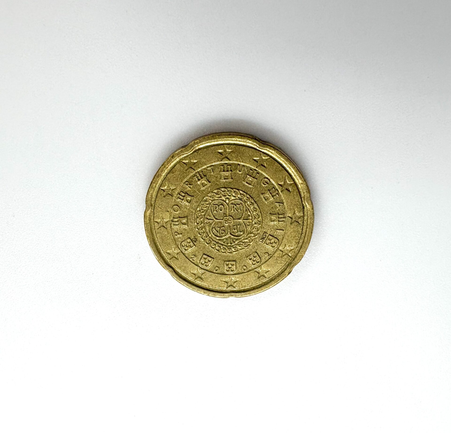 Moeda portuguesa redonda em metal dourado, seu valor é de 20 centavos de euro, do ano de 2002. No seu anverso possui o Selo Real de 1142 rodeado por sete castelos e cinco escudos com um anel de estrelas representando o diálogo entre os diferentes países europeus. O reverso, possui o mapa da União Europeia, junto com duas faixas compostas por 6 estrelas que
