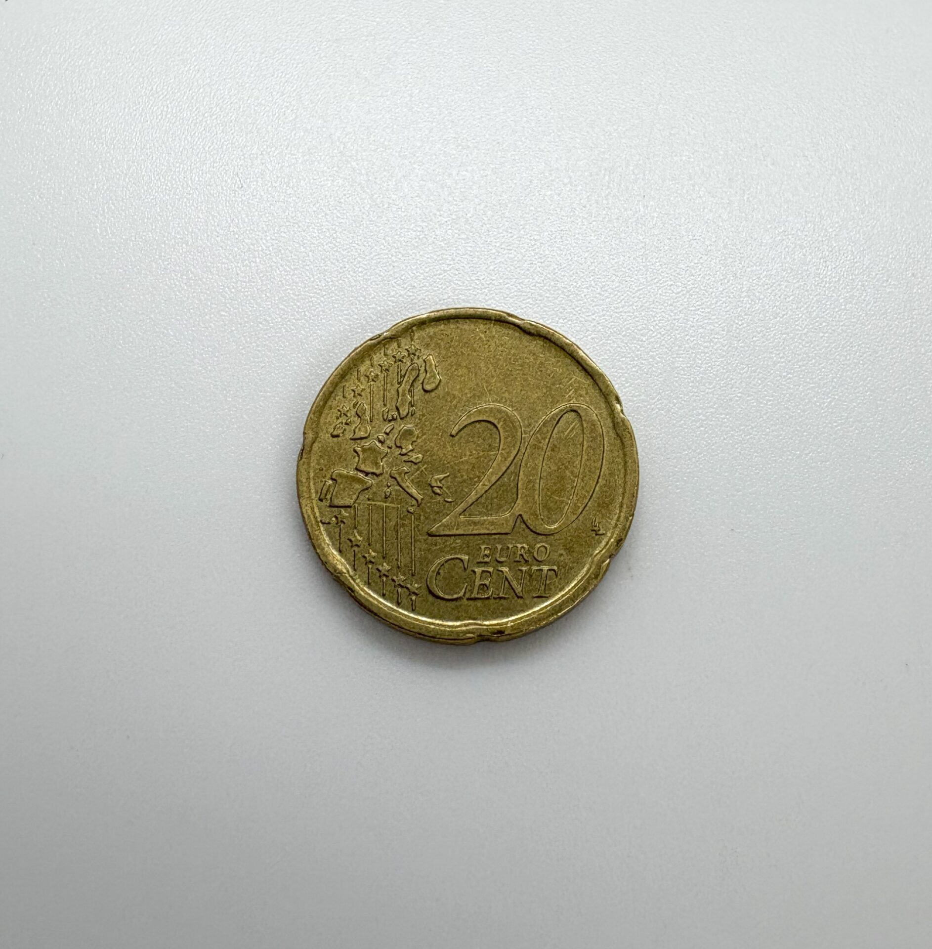 Moeda portuguesa redonda em metal dourado, seu valor é de 20 centavos de euro, do ano de 2002. No seu anverso possui o Selo Real de 1142 rodeado por sete castelos e cinco escudos com um anel de estrelas representando o diálogo entre os diferentes países europeus. O reverso, possui o mapa da União Europeia, junto com duas faixas compostas por 6 estrelas que correspondem às da bandeira da mesma, que simbolizam os ideais de união, cooperação e harmonia entre os povos da Europa, e a inscrição “20 EURO CENTS”. Bordo é serrilhado.