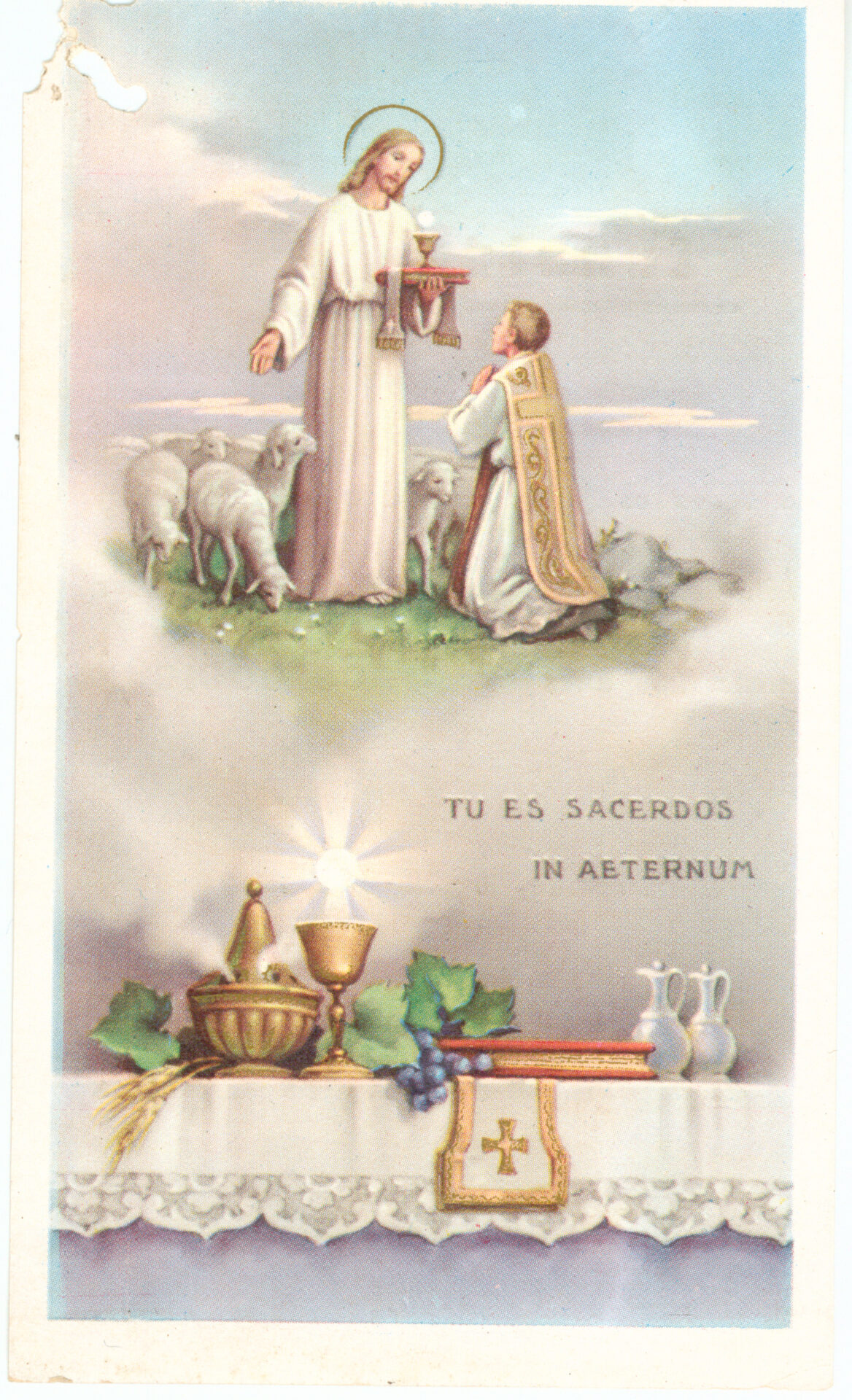 Pequeno cartão retangular. Ao centro uma imagem impressa em dois planos: na parte inferior possui o desenho de um altar com toalha branca. Sobre o altar há um defumador dourado, um cálice dourado com uma hóstia pairando sobre ele, uma bíblia e dois jarros brancos. Dentre os objetos há ramos de uva e trigo. Ao lado da figura há a inscrição: “TU ES SACERDOS IN AETERNUM” (Tu és sacerdote para sempre). Em segundo plano, na parte superior do cartão, separada por nuvens, há uma imagem de Jesus Cristo, rodeado por cordeiros, segurando um cálice com uma hóstia, e à frente há um padre, usando vestes litúrgicas, ajoelhado. Jesus está a oferecer a ele a hóstia.