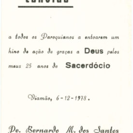 Pequeno cartão retangular. Ao centro uma imagem impressa em dois planos: na parte inferior possui o desenho de um altar com toalha branca. Sobre o altar há um defumador dourado, um cálice dourado com uma hóstia pairando sobre ele, uma bíblia e dois jarros brancos. Dentre os objetos há ramos de uva e trigo. Ao lado da figura há a inscrição: “TU ES SACERDOS IN AETERNUM” (Tu és sacerdote para sempre). Em segundo plano, na parte superior do cartão, separada por nuvens, há uma imagem de Jesus Cristo, rodeado por cordeiros, segurando um cálice com uma hóstia, e à frente há um padre, usando vestes litúrgicas, ajoelhado. Jesus está a oferecer a ele a hóstia. O verso é de coloração branca e possui a seguinte inscrição impressa em tinta preta: “Convido a todos os Paroquianos a entoarem um hino de ação de graças a DEUS pelos meus 25 anos de Sacerdócio”, “Viamão, 6-12-1978.”, “Pe. Bernardo M. dos Santos”, “VIII Nº 145” e a marca da gráfica “Cromocart - Indústria Brasileira”.