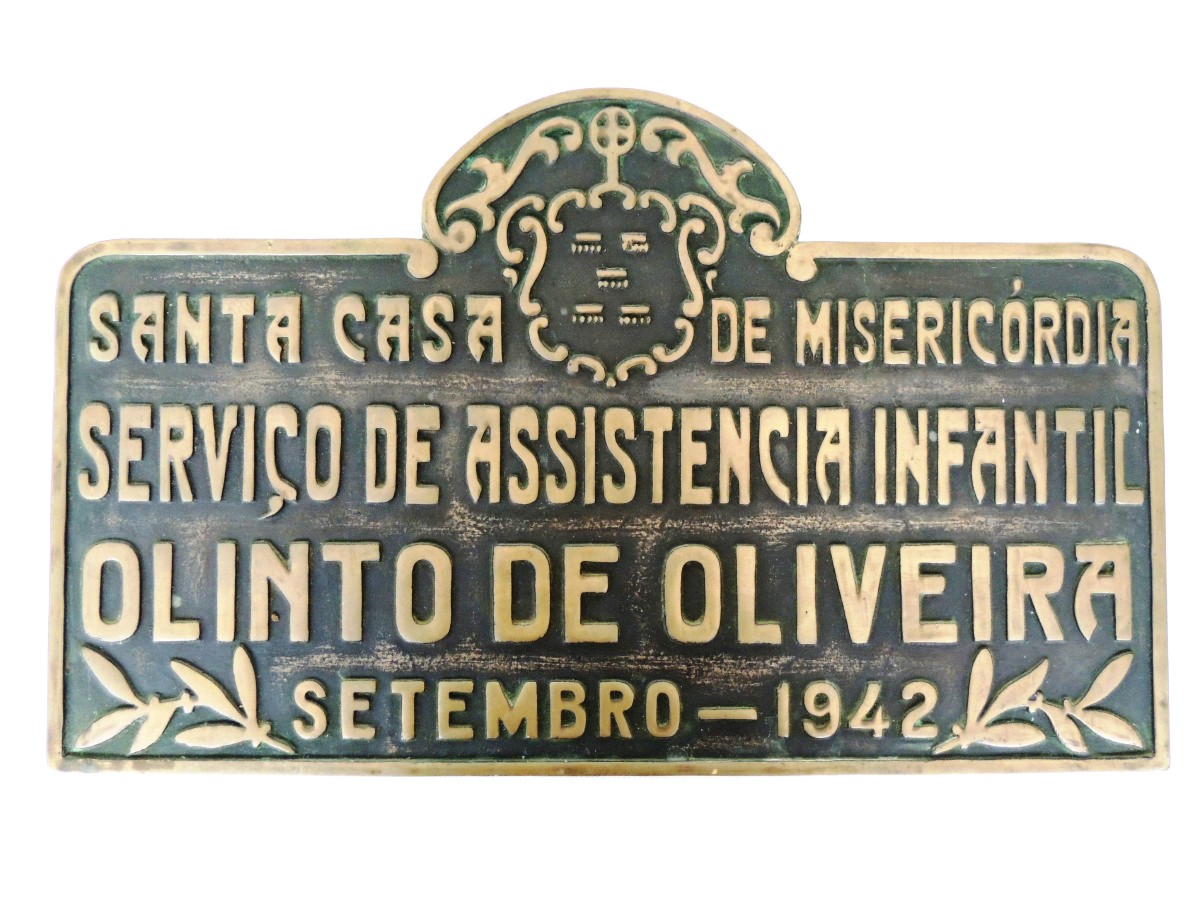 Placa de formato retangular em bronze. Na parte superior do centro, tem representado em relevo, o brasão da Irmandade da Santa Casa de Misericórdia de Porto Alegre, na parte inferior a representação de folhas de louro. Possui fundo de tonalidade escura, inscrições e ornamentação são de coloração dourada. Apresenta a seguinte inscrição: "Santa Casa de Misericórdia / Serviço de Assistencia Infantil Olinto de Oliveira / Setembro - 1942".